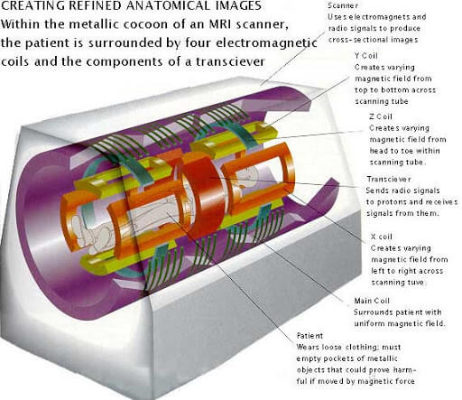 MRI or Magnetic Resonance Imaging uses a powerful magnet to bring protons into equilibrium in the patient’s body. 4 coils influence the behaviour of these protons to bring them to the MRI sensors. The speed at which these protons collide with the sensors records the intensity of the result.
